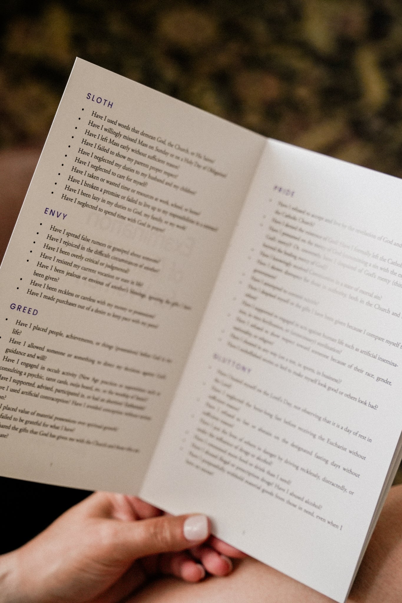 Enter—this Examination of Conscience booklet! Inside, you'll find a series of questions/prompts that cover different aspects of life, such as relationships, lifestyle, prayer, gratitude, and more. The prompts all fall under the categories of the 7 deadly sins (Pride, Envy, etc.) so that you can understand where your habits of sin might be coming from, and you can pursue holiness with the Lord.